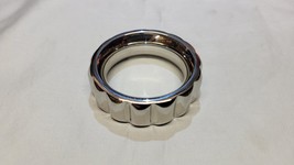 The ‘button strap’ design is one such design. It features a scalloped set of ridges along the outer diameter of the ring finished in a highly polished stainless steel. It’s visually interesting because of the various angles that light can hit the adornment and reflect back. If it were faceted, I’d dare call it a blingy ring. Because I have WAY more cock rings than shaft rings and because I’m unlikely to wear a decked out set, I decided to just dip my toe in the water and only purchase a cock ring perfectly sized to be a shaft ring.