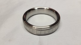 While the design was inspired by having a rounded inner field, prototypes showed that a plain, curved surface was too bland. To address this, I added carved vertical lines to break up the horizontal field. This worked well, and after a bit of experimentation, I settled on an evenly spaced set of cuts that gave a square appearance. Because I came to love the rounded outer profile that mates into a slightly raised “border” on the outside surface of the ring, I carried that facet of the design forward. I think it looks great! With this particular adornment made of stainless steel instead of aluminum, the regal design is augmented with a polished and dark hued metal finish.