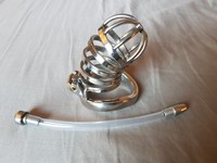 This handsome cage features a contoured cock ring in multiple sizes and a newer barrel-style locking mechanism as opposed to a traditional padlock style. The catheter is optional, but can definitely help with draining while locked up.