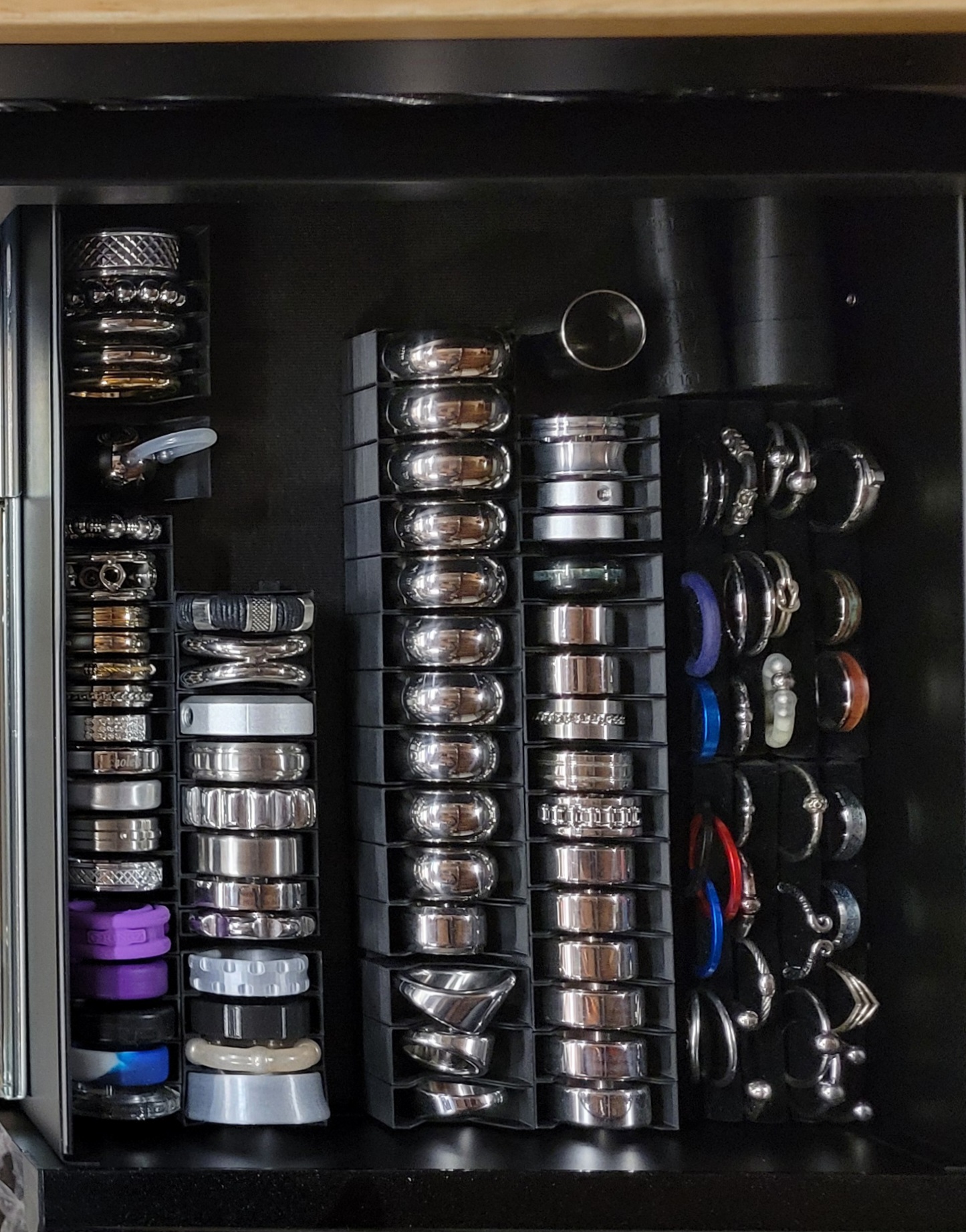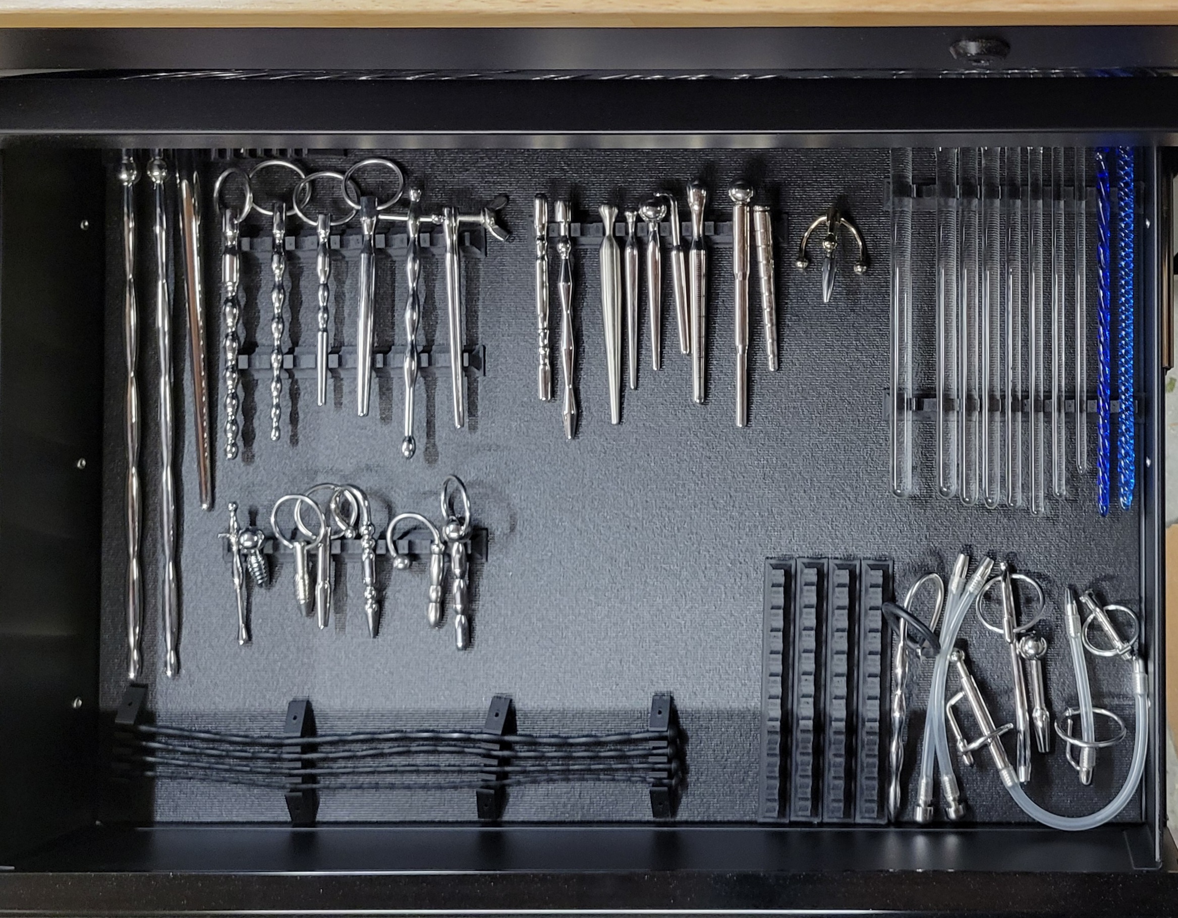 I touch on this above, but a sensible layout for adornment storage is critical. Square inches being the “king” requirement puts most of the attention on the dimensions of the drawers, but the height of the drawers and how they are laid out also comes into focus. When flipping over to a 42" wide format, I didn’t even think about the value of having a full-width drawer… but I can’t imagine a storage solution without it now that I have placed all of my cock rings there front-and-center! In fact, I have so many that the drawer is surprisingly full.