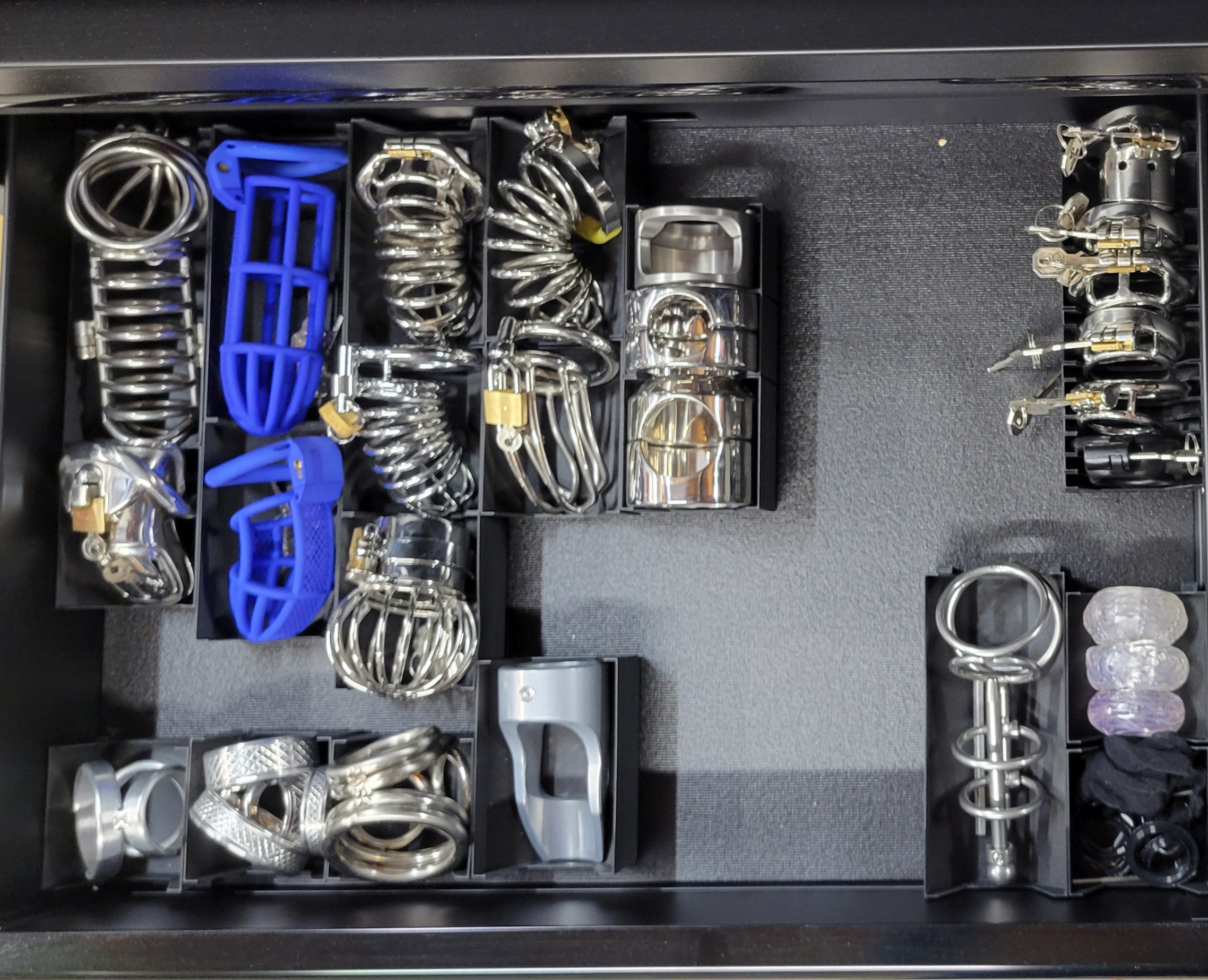 - A single full-width 37 1/2" x 15 1/2" top drawer holds the most impressive part of my collection - all of the cock rings