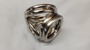 I have had my eye on this behemoth for a long time. It’s no secret that I love multi-ring setups. Two of my favorites are triple-ring setups with a cock, shaft, and ball ring. There’s just something about having my manhood wrapped in lots of metal. It was a nobrainer that this quad cage would show up in my collection given the thick wire size and the multi-ring design.