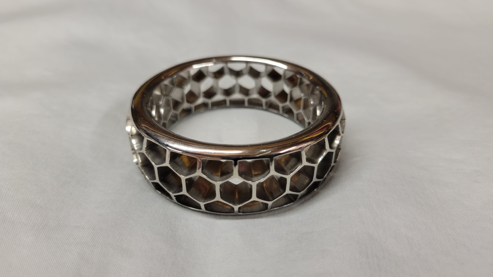 Since the adornment is skeletonized, I wanted a bit more “heft” to the ring in terms of size. As is my usual size, the inner diameter is 1.866" (design was 1.875") but the width has been bumped up to .781" to accommodate three rows of hexagons. It seems thick, but only has a .31" height which isn’t much taller than my typical rings. I guess the angled top and bottom row served their purpose in making the ring seem chunkier! Even though this fairly large ring is made of stainless steel, it’s practically imperceptible - it only weighs 1.8oz!